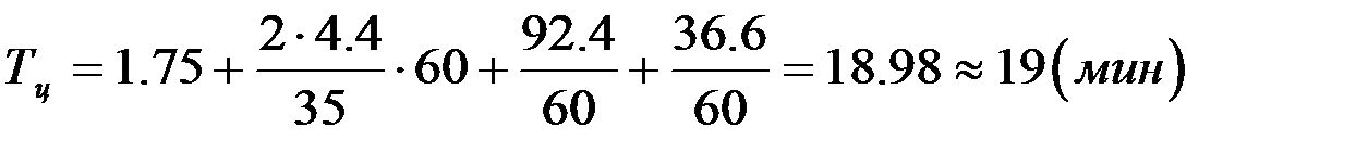 где: Л – среднее расстояние перевозки грунта (4.4км) Vср – средняя скорость движения самосвала (35 км/ч) tрм, tм – время разгрузки с маневрированием и время маневрирования в забое (92,4 сек; 36,6 сек)