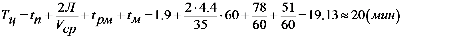 где: Л – среднее расстояние перевозки грунта (4.4км) Vср – средняя скорость движения самосвала (35 км/ч) tрм, tм – время разгрузки с маневрированием и время маневрирования в забое (78мин; 51 мин)