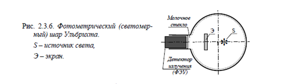 Если ρ → 1, то Е → ∞. Рожденный источником свет никуда не ис- чезает, так что бесконечно накапливается. Поскольку всегда ρ < 1 и су- ществуют потери света на неизбежных технологических отверстиях, в том числе – для ввода излучения или самого источника излучения (как на рис. 2.3.7), для вывода света на регистрацию и т.д., то Е всегда ко- нечна. Более того, из-за потерь света возникает и неравномерность ос- вещения внутренней поверхности. Идеальная равномерность может быть достигнута при бесконечном числе переотражений, а в реальных конструкциях оно составляет 10 – 100. В стенке шара имеется небольшое отверстие, на которое не падает первичный поток, а только – вторичный (для этого введен экран Э, по- крытый таким же отражающим слоем, как и сфера). Освещенность окна определяется выражением (2.3.2). Но этот свет идет в окно из телесного угла 2π и его угловое распределение зависит и от положения источника.