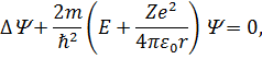 Для отримання мінімального значення радіусу орбіти електрона в атомі водню покладемо Однак не зважаючи на такі успіхи теорії Бора виникали серйозні труднощі при обчисленні інтенсивності спектральних ліній і їх поляризації. Невдачею закінчились спроби побудувати модель для атома гелію. Постулат Бора про існування стаціонарних орбіт суперечив законам класичної електродинаміки. Згідно цих законів будь-яка заряджена частинка, в якої вектор швидкості не є сталою величиною, повинен випромінювати електромагнітне випромінювання. Електрон, який обертається навколо ядра, повинен втрачати енергію за рахунок випромінювання електромагнітних хвиль і у кінцевому впасти на ядро. Не були з’ясовані фізичні причини стійкості орбіт. Не дивлячись на вказані недоліки, теорія Бора відіграла позитивну роль у розвитку науки. Вона сприяла ломці старих і формуванню нових фізичних уявлень. Квантово-механічний опис атома водню. Сучасні уявлення про будову атомів базуються на результатах застосування рівняння Шредінгера – фундаментального лінійного диференціального рівняння квантової механіки. Загальне рівняння Шредінгера (рівняння Шредінгера, яке залежить від часу):