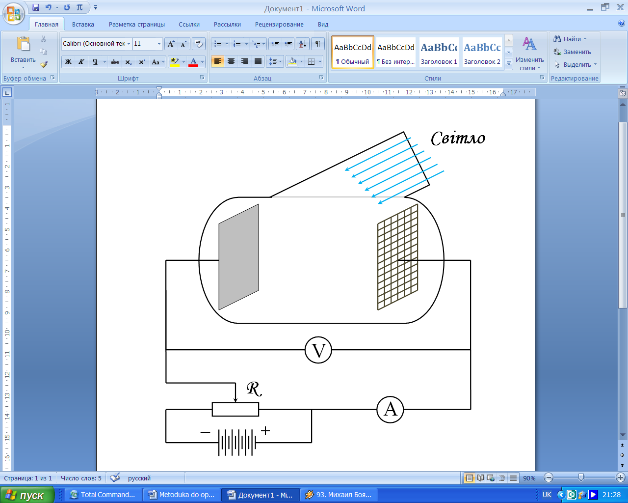 Рисунок 1 – Схема установки для дослідження залежності фотоструму від напруги і сили світла.