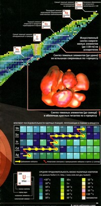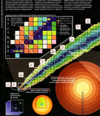| Одиночные звезды в два раза легче нашего Солнца, останавливаются на этапе синтеза гелия. Более тяжелые звезды производят углерод и кислород, и только самые большие, превосходящие 10 солнечных масс, могут в конце жизни продолжить игру в элементы. После истощения запасов гелия их внутренние области сжимаются, разогреваются, и в них начинается «горение» углерода. Два ядра углерода, соединяясь, дают неон и альфа-частицу. Или натрий и протон. Или магний и нейтрон. Появившиеся протоны и нейтроны тоже не пропадают зря. Они идут в дело, превращая углерод в азот, кислород и, далее, за счет захвата альфа-частиц в неон, кремний, магний и алюминий. Таким образом, нам уже есть из чего сделать впоследствии твердь земную. После углерода вне очереди начинает «гореть» неон, причем делает он это «неправильным» образом: вместо того, чтобы сразу слиться с каким-нибудь другим ядром и увеличить свою массу, ядра неона под действием особо энергичных гамма-квантов распадаются на кислород и альфа-частицу. А затем получаемые альфа-частицы, взаимодействуя с другими ядрами неона, дают магний. Так что в итоге на два ядра неона возникают одно кислородное и одно магниевое. После истощения запасов неона ядро звезды становится кислородно-магниевым, оно снова поджимается, температура растет и игра продолжается. Теперь ядра кислорода, попарно сливаясь, превращаются в кремний или серу. Кроме того, появляется немного аргона, кальция, хлора и других элементов. Следующий на очереди — кремний. Напрямую два ядра кремния слиться не могут — из-за большого заряда слишком велико электрическое отталкивание между ними. Поэтому начинает идти множество разных реакций с участием альфа-частиц. Термин «горение кремния» достаточно условен, поскольку разных каналов реакций в самом деле много. На этой стадии возникают разные элементы вплоть до железа. Железо (и близкий к нему никель) выделяется из всех элементов тем, что у него максимальная энергия связи. Нуклоны нельзя упаковать эффективнее: и на то, чтобы разбить ядро железа на части, и на то, чтобы создать из него более тяжелые ядра, требуется затратить энергию. Поэтому первое время было непонятно, как может образование элементов в звездах идти дальше железа, и существование во Вселенной тяжелых ядер, как, например, у золота или урана, оставалось совершенно необъяснимым. Подход к объяснению был найден в середине 1950-х годов, когда были предложены сразу два механизма образования в звездах элементов тяжелее железа. Оба они основываются на способности ядер захватывать нейтроны.