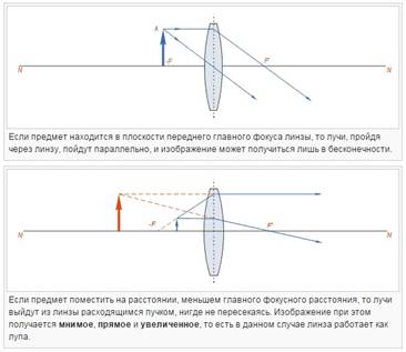 12.2. Преломляющий угол призмы для почти нормального падения (что?) 13. Линзы 13.1. Линза - деталь из оптически прозрачного однородного материала, ограниченная двумя полированными преломляющими поверхностями вращения, например, сферическими или плоской и сферической. 13.2. Характерные точки – оптический центр, фокус, двойной фокус. 13.3. Оси – главная оптическая ось, побочная оптическая ось (через оптический центр). 13.4. Плоскости - фокальная плоскость (через фокус, перпендикулярно главной оптической оси), 13.5. Правила построения изображения в собирающей линзе 13.5.1. Луч, идущий через оптический центр линзы, не преломляется. 13.5.2. Луч, идущий параллельно главной оптической оси линзы, после преломления пойдет через главный фокус. 13.5.3. Если луч падает на линзу наклонно, то для построения его дальнейшего хода мы проводим побочную оптическую ось, параллельную этому лучу, и находим соответствующий побочный фокус. Через этот побочный фокус и пойдет преломленный луч. 13.6. Правила построения изображения в рассеивающей линзе 13.6.1. Луч, идущий через оптический центр линзы, не преломляется. 13.6.2. Луч, идущий параллельно главной оптической оси линзы, после преломления начнёт удалятся от главной оптической оси; при этом продолжение преломленного луча пройдет через главный фокус. 13.6.3. Если луч падает на линзу наклонно, то мы проводим побочную оптическую ось, параллельную этому лучу, и находим соответствующий побочный фокус. Преломленный луч пойдет так, словно он исходит из этого побочного фокуса. 14. Собирающая линза 14.1. Классификация изображений в собирающей линзе