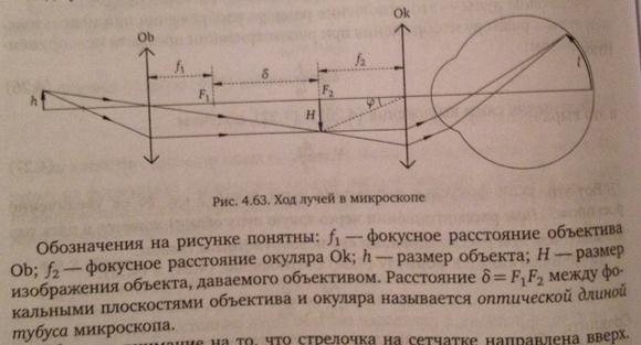 Роговица и хрусталик (переменное фокусное расстояние) – линзы. Сетчатка – экран. Нерв – передача изображения в мозг (перевернутого). 19.2. Дефекты зрения: Близорукость – дефект зрения, при котором фокусное расстояние расслабленного глаза меньше расстояния от оптического центра до сетчатки. Дальнозоркость – дефект зрения, при котором фокусное расстояние расслабленного глаза больше расстояния от оптического центра до сетчатки. 19.3. Очки: рассеивающие (в первом случае) или собирающие (во втором случае) линзы. 20. Оптические приборы 20.1. Лупа – простая собирающая линза (или система линз); фокусное расстояние лупы обычно находится в диапазоне от 5 до 125 мм. Увеличение: Г = d0/f, где d0 – расстояние наилучшего зрения, f – расстояние от предмета до лупы. 20.2. Микроскоп – система линз – объектива и окуляра.