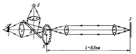 c=4LNv Используя метод вращающегося затвора, Физо в 1849 г. по- лучил значение скорости света с = 3,13-10**5 км/с, что было совсем неплохо по тем временам. В дальнейшем использование раз- личных затворов позволило существенно уточнить значение ско- рости света. Так, в 1950 г. получено значение скорости света (в вакууме), равное