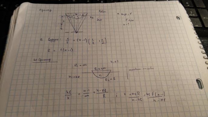 15. Рассеивающая линза 15.1. Классификация изображений в рассеивающей линзе: всегда мнимое, прямое, уменьшенное. 16. Фокусы 16.1. Фокусное расстояние через радиусы кривизны: Величина фокусного расстояния положительна для собирающих линз, и отрицательна для рассеивающих. 16.2. Оптическая сила линзы: D = n0/f [м^(-1)] или [диоптрии] 17. Еще линзы 17.1. Формула тонкой линзы: