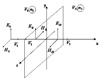 Пусть на границу двух диэлектриков с показателями преломления n1 и n2 нормально падает плоская монохроматическая волна. Определим характеристики отражённой и преломлённой волн и коэффициенты преломления и отражения, если