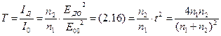 Формулы (2.18) и (2.19) называются формулами Френеля при нормальном падении света. Из этих формул следует: 1. R+T=1. При энергетическом расчете определяют коэффициент отражения по (2.18), а коэффициент пропускания по T=1-R. Если свет распространяется из воздуха в стекло n=1,52, R=0,0426, то есть 4,26% света отражается, а 95,74% света проходит. Если свет распространяется из второй среды в первую то: 2. R21=R12, Т21=Т12; 3. Определим коэффициент пропускания и потери на отражения: n1=1 n2=n n3=1
