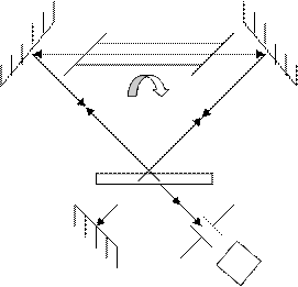 распространяется по замкнутому контуру. Для усиления этого луча необходимо, что бы после прохождения контура, световая волна возвращалась в исходное положение в фазе, то есть на периметре контура Р должно укладываться целое число длин волн P=ml Аналогичным образом в таком интерферометре распространяется в противоположном направлении луч 2. После отражения и преломления этих лучей от зеркала З3 на фотоприемник падает 2 когерентных луча 1’ и 2’, которые образуют интерференционную картину в плоскости диафрагмы. Если такой интерферометр неподвижен, то частота этих волн равна: n0 = c/l = cm/p (4.72) Если гироскоп вращается с угловой скоростью w, то за время прохождения лучей по контуру он повернется на некоторый угол. Это приведет к тому, что условие максимумов для разных лучей будет выполняться для разных длин волн или для разных частот. При этом частоты лучей 1 и 2 будут равны: n1,2 = n0±2n0 AWcosq/cp, где (4.73) А- площадь контура W- угловая скорость вращения q- угол между вектором угловой скорости и нормалью к гироскопу. В плоскости диафрагмы образуется подвижная картина с частотой: Dn = n1-n2=BFcosq (4.74) F=W/2p частота вращения В=8pА/l0p Измеряя частоту эл-кого сигнала Dn можно определить частоту вращения гироскопа. F=Dn/Bcosq (4.75) Рассмотренное явление называется эффектом Саньяка (1913).Основным достоинством лазерных гироскопов является отсутствие вращ. элементов и высокая точность измерения. Для серийных гироскопов DW~ 10-3 град/час. Если известна угловая скорость вращения земли W= 360/24=15 град/час, то из формулы (4.74) можно определить угол q, который составляет широту местоположения. Date: 2015-05-18; view: 617; Нарушение авторских прав |