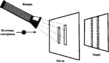 Рис. 17. Когда мы пытаемся определять, через какую щель проходит электрон, направляя на щели фонарь, электрон демонстрирует свою корпускулярную природу. Есть только две полосы — в точности так, как следовало бы ожидать, если бы электроны были миниатюрными шариками