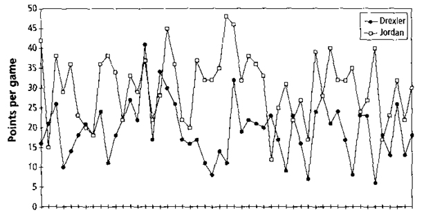 Так как независимое воспроизведение опытов представляет собой ключ к получению приемлемых научных доказательств, мы нуждаемся в оценке этого воспроизведения. Методика, наиболее широко принятая сегодня называется мета - анализом — анализом анализа. Концептуально, мета - анализ простая вещь. Например, в бейсболе нам было ясно, что Микки исключительно хороший игрок, так как он забивал примерно 30% голов из всего числа попыток. Этот вывод был основан на целых тысячах попыток и тысячах забитых мячей, а не на одиночной игре. Если вернуться к единичному psi-феномену, то выдающийся результат одного человека в одном опыте расценивался нами бы не более, чем интересное совпадение. Следующие удачные эксперименты того же самого человека, скажем, в тысяче испытаний заставили бы нас поверить в феномен psi Допустим, нам надо разобраться, кто был лучшим игроком в бейсболе по забитым мячам -Майкл Джордан из команды «Быки Чикаго» или Клайд Дрекслер из команды «Хьюстонские Ракеты». На рис. 4.1 точками показаны число забитых мячей этими двумя игроками в играх с 3 ноября 1995 по 18 апреля 1996. При этом наш испытанный аналитик Джо Сикспак тоже видел некоторые игры и также хотел разобраться в проблеме «кто есть кто». Если Джо посетил только семь игр, когда Дрекслер набирал больше очков, чем Джордан (например, 2 декабря, 1995, Дрекслер набрал 41 очко, а Джордан - 37), то разумное заключение Джо будет то, что Дрекслер играет лучше, чем Джордан.