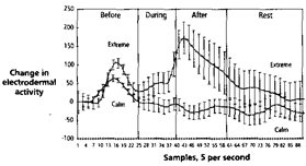 Рис. 7.3. В согласии с теорией условных рефлексов, электродермальная активность после показа изображений значительно выше для эмоциональных фотографий, чем для спокойных. Однако, электродермальная активность выше и перед показом эмоциональных изображений, чем перед показом спокойных. Напомним, что участник эксперимента не знает, какую фотографию ему будут показывать, но предчувствует ее появление. На этом графике и на рис. 7.4, 7.5 показаны объединенные результаты 24 участников, которые просмотрели 900 изображений. Доверительный интервал равен 65%.