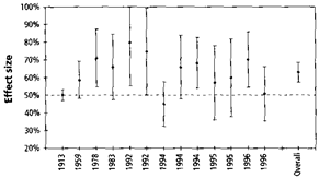 Рис. 9.2. Величина эффекта для эксперимента «ощущение пристального взгляда». Цифра в 50% - величина случайного ожидания. Доверительный интервал равен 95%. Резюме