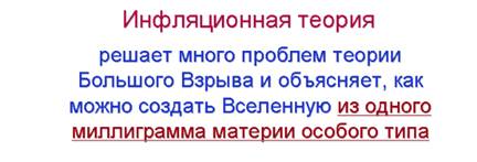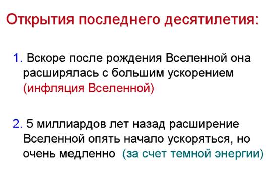 Вот это открытие последних девяти лет. Сначала люди думали, что, ну, где-нибудь экспериментальная ошибка, еще что-то, потом стали называть их разными словами — космологическая постоянная, энергия вакуума, темная энергия... Значит, вот это то, что произошло недавно. Теория о которой я сейчас буду говорить, — это инфляционная космология. Она предполагает (и сейчас всё больше кажется, что, наверное, это было правильное предположение, мы еще всё равно в точности не знаем — есть конкурирующие теории, хотя они мне там и не нравятся, но, значит, это точки зрения) — но кажется, что это вот правильная вещь, — что в ранней Вселенной, по-видимому, Вселенная тоже расширялась ускоренно. Причем с гораздо большим ускорением, чем то, с каким она расширяется сейчас, — на много десятков порядков большим ускорением. Вот эти два открытия... по-видимому, их надо попытаться интерпретировать как-то.