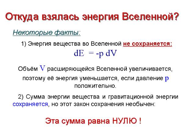 Вот во всех моделях Вселенной, нормальных, тех, которые были ассоциированы с теорией Большого взрыва, полная энергия Вселенной уменьшалась. Если сейчас 1050 т, то сколько же было в начале? Потому что энергия-то только тратилась. Значит, тогда в начале должно было быть больше. Кто-то должен был сделать эту Вселенную с гораздо большей энергией, чем сейчас. С другой стороны, что-то же должно сохраняться. А куда тратится эта энергия во время расширения Вселенной? Она тратится на то, что размер Вселенной меняется, что Вселенная расширяется с некоторой скоростью. Есть некоторая энергия, которая прячется в геометрии Вселенной. Есть энергия, которая связана с гравитацией. И вот полная сумма энергии вещества и гравитационной энергии, она сохраняется. Но только если посчитать полную сумму. Есть разные способы счета — и опять там запятая некая ставится, — но при некотором способе счета полная сумма энергии вещества и гравитации, она просто равна нулю. То есть энергия материи компенсируется энергией гравитационного взаимодействия, поэтому есть ноль. И поэтому, да, она началась с нуля, она нулем и кончится, всё сохраняется, но только этот закон сохранения, он не очень полезен для нас. Он не объясняет нам, откуда же такая огромная энергия взялась. Значит, сколько?