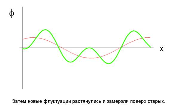 После этого, на фоне этой флуктуации, которая нарисована здесь, прежние флуктуации, которые раньше были очень коротковолновыми, энергичными и так далее, они растянулись, увидели, что Вселенная расширяется, почувствовали трение и застыли — на фоне тех флуктуаций, которые раньше застыли.