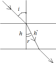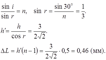 Изменение оптической длины пути будет равно D L = L 2 – L 1 = L 1 + h (n – 1) – L 1 = h (n – 1). D L = 1×(1,5–1)=0,5 (мм). Во втором случае луч, падая на пластинку, будет преломляться, то есть проходить в пластинке путь h ΄ ¹ h, который найдем, пользуясь законом преломления