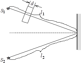 Задача 2. От двух когерентных источников S 1 и S 2 (l=0,8 мкм) лучи попадают на экран, на котором наблюдается интерференционная картина. Когда на пути одного из лучей перпендикулярно ему помещается мыльная пленка (n =1,33), интерференционная картина изменяется на противоположную. При какой наименьшей толщине пленки это возможно?
