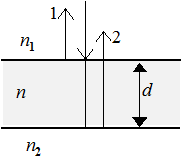 Задача 3. Плоскопараллельная стеклянная пластинка толщиной 1,2 мкм и показателем преломления n =1,5 помещена между двумя средами с показателями преломления n 1 и n 2 рис. 3. Свет с длиной волны l=0,6 мкм падает нормально на пластинку. Определить результат интерференции световых лучей 1 и 2, отраженных от верхней и нижней поверхностей пластинки, в следующих случаях: 1) n 1 < n < n 2; 2) n 1 > n > n 2; 3) n 1 < n > n 2; 4) n 1 > n < n 2.