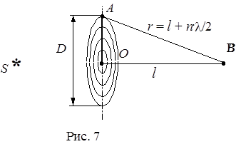 Задача 7. На диафрагму с диаметром отверстия 1,96 мм рис. 7 падает нормально параллельный пучок монохроматического света (l=600 нм). При каком наибольшем расстоянии между диафрагмой и экраном в центре дифракционной картины еще будет наблюдаться темное пятно?