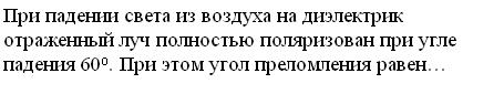 55. Параллельный пучок света падает по нормали на зачерненную плоскую поверхность, производя давление Р. При замене поверхности на зеркальную давление света не изменяется, если угол падения (отсчитываемый от нормали к поверхности) будет равен… d) 60o