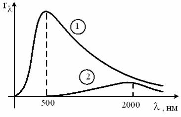 34. На рисунке показаны кривые зависимости спектральной плотности энергетической светимости абсолютно черного тела от длины волны при разных температурах. Если кривая 2 соответствует спектру излучения абсолютно черного тела при температуре 1500 К, то кривая 1 соответствует температуре (в К)...