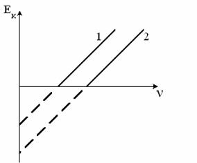 41. На рисунке представлены две зависимости кинетической энергии фотоэлектронов Еk от частоты n падающего света.