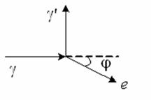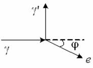 51. На рисунке показаны направления падающего фотона (g), рассеянного фотона (g'), и электрона отдачи (е). Угол рассеяния 90°, направление движения электрона отдачи составляет с направлением падающего фотона угол j = 30°. Если импульс электрона отдачи 3(МэВ× с)/м, то импульс рассеянного фотона (в тех же единицах) равен...
