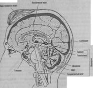 Рис. 2.1. Мозг Лимбическую систему называют «седалищем эмоций». Она состоит из таламуса и гипоталамуса (то есть промежуточного мозга) и других структур, играющих важную роль в психологии стресса. Лимбическая система связана с промежуточным мозгом и несет первичную ответственность за эмоции и их проявление в поведении. Лимбическая система отвечает за проявление таких эмоций, как страх, тревожность и радость в ответ на физические и психофизиологические раздражители. Кора головного мозга (называемая серым веществом) контролирует абстрактные функции высшего порядка — речь и рассуждение. Кора мозга также регулирует деятельность низших структур мозга. Например, промежуточный мозг передает страх, а кора включает функцию рассуждения, чтобы распознать стимул и убедиться в его безопасности и таким образом преодолеть страх. Наконец, существует еще так называемая ретикулярная формация (РФ). В прошлом полагали, что кортикальные и субкортикальные функции дихотомичны. То есть считалось, что либо та, либо другая часть мозга отвечает за поведение человека. На данный же момент исследователи мозга пришли к убеждению, что между корой и подкоркой существуют нервные связи, по которым информация передается в обоих направлениях. Эту нервную сеть, которая называется РФ, по праву можно считать связующей нитью между телом и сознанием. «Ретикулярная формация подобна улице с двусторонним движением, по которой передаются сообщения от высших мозговых центров к внутренним органам и мышцам, а также стимулы, воспринятые на мышечном или органическом уровне, к коре головного мозга. Таким образом, чисто физический по природе стрессор может влиять на высшие мыслительные центры, а стрессор, который воздействует на психику или интеллект, может спровоцировать нейрофизиологическую реакцию» [1].