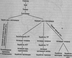 Рис. 2.2. Стресс и пути стрессовой реакции Итак, мы обрисовали основные структуры мозга. Теперь посмотрим, как стрессор влияет на мозг и как мозг подготавливает весь организм к реакции. Когда мы сталкиваемся со стрессором, различные части тела (глаза, нос, мускулы и так далее), замечающие его в первую очередь, посылают сигналы по нервным путям к мозгу. Эти сигналы проходят по ретикулярной формации, по направлению от лимбической системы и таламуса и по направлению к ним. Именно в лимбической системе зарождаются эмоции, а таламус служит как бы пультом переключения, который определяет, что делать с поступившими сигналами. Затем в игру вступает гипоталамус. Когда гипоталамус сталкивается со стрессором, он активизирует деятельность двух основных путей стрессовой реактивности: эндокринную систему и автономную (периферийную) нервную систему. Чтобы активировать эндокринную систему, в передней части гипоталамуса вырабатывается кортикотропный рилизинг-гормон (КРГ), который действует на гипофиз таким образом, что там начинает вырабатываться адренокортикотропный гормон (АКТГ). АКТГ в свою очередь активирует кору надпочечников, где вырабатываются кортикоидные гормоны. Чтобы активировать автономную нервную систему, сигнал посылается из задней части гипоталамуса по нервным путям к мозговому веществу надпочечников. На рис. 2.2 изображены пути стрессовой активности организма. У гипоталамуса есть и другие функции. Одна из них — выработка тириотропного рилизинг-гормона (ТРГ) в своей передней части. Этот гормон активирует гипофиз, который начинает вырабатывать тириотропный гормон (ТТГ). ТТГ активирует тириоидные ядра, которые начинают вырабатывать тироксин. Задняя часть гипоталамуса также стимулирует ядра гипофиза, в результате чего в них начинают вырабатываться окситоцин и вазопрессин (АДГ) [2]. Функции этих гормонов (выделяемых в надпочечниках, тироксина, окситоцина и вазопрессина) мы обсудим чуть позже. Теперь, когда у вас сложилось представление о взаимоотношениях стресса и мозга, наверное, вам будет интересно узнать о результатах исследований на тему «Может ли стресс стать причиной необратимых нарушений мозга» [3]. Чтобы усвоить этот материал, необходимо владеть достаточно большим объемом информации. Для начала нужно знать, что гиппокамп — именно та часть мозга, которая «бьет тревогу» при столкновении со стрессором. Далее необходимо знать, что надпочечники вырабатывают гормоны, называемые глюкокортикоидами. Присутствие этих гормонов в организме определяется рецепторами клеток гиппокампа. Продолжительный стресс разрушает эти рецепторы и клетки гиппокампа в целом. А так как клетки мозга не восстанавливаются, то мы теряем их навсегда. Сетевой механизм этого процесса еще не изучен до конца, но, возможно, мы не реагируем на стресс, если у нас недостаточно глюкокортикоидных рецепторов. Для прояснения этого процесса ученые продолжают проводить исследования. Эндокринная система Одна из самых важных систем нашего организма, непосредственно связанная со стрессовой реактивностью, — эндокринная система. В нее входят все железы, выделяющие гормоны. Эти гормоны изменяют функционирование остальных тканей организма и разносятся с помощью кровеносной системы к местам назначения. желГзьг ялГ няяп ^ЮЧаеТ В СебЯ: ГИП°ФИ3' *™B*W- и паращитов