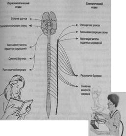 Рис. 2.5. Нервная система состоит из головного мозга, спинного мозга и множества периферических нервов Слушайте, братья и сестры! Хорошие новости ожидают нас. Как мы увидим, исследования стресса показывают, что мы обладаем гораздо большим контролем, чем думаем. Непроизвольные функции организма контролируются автономной (периферийной) нервной системой. На рис. 2.5 изображена общая схема нервной системы. Примеры непроизвольных функций — сердцебиение, артериальное давление, ритм дыхания и гуморальная регуляция деятельности организма. Этот контроль осуществляется двумя компонентами автономной нервной системы: симпатической и парасимпатической (рис. 2.6). Симпатическая нервная система отвечает за энергетические растраты (например, учащение ритма дыхания), а парасимпатическая — за сохранение энергии (например, снижение частоты дыхания). Когда вы сталкиваетесь со стрессором, симпатическая нервная система активируется гипоталамусом, и в организме происходят следующие изменения: 1) учащается сердцебиение; 2) усиливаются сердечные сокращения; 3) расширяются коронарные артерии; 4) сужаются брюшные артерии; 5) расширяются зрачки; 6) расширяются бронхиальные трубки; 7) возрастает сила скелетных мышц; 8) в печени вырабатывается глюкоза; 9) мыслительная деятельность становится продуктивнее; 10) расширяются артерии, проходящие в самой толще скелетных мышц; 11) значительно учащается базальный ритм метаболизма. Благодаря этим физиологическим изменениям люди в чрезвычайных ситуациях способны совершать невероятные поступки. Когда достаточно хилый человек поднимает машину, которой придавило ребенка, можно говорить о невероятной силе, сообщаемой нам реакцией борьбы или бегства. Функцией парасимпатической нервной системы является возвращение нас в расслабленное состояние после того, как угроза миновала. Теперь вернемся к моему обещанию по поводу хороших новостей. Первым научным открытием, которое укрепляет, а не уничижает самооценку человека, стало утверждение о том, что все непроизвольные функции человеческого организма не полностью непроизвольны. Исследование механизма биологической обратной связи, который позволяет нам получать информацию о том, что происходит в организме, позволило ученым приступить к изучению произвольного контроля над непроизвольными процессами. Например, люди научились контролировать свое артериальное давление, регулировать ритм дыхания и сердцебиения, вырабатывать определенные волны мозговой активности, а также сужать и расширять кровеносные сосуды в разных частях тела. Другими словами, теперь люди знают, что способны контролировать себя и свой организм в большей степени, чем они предполагали. Считается, что именно знание оказывает влияние на поддержание уровня адекватной самооценки у людей. Стоит также заострить внимание на важности понимания того, что мы, будучи способны контролировать свою физиологию, позволяем себе заболеть. Если только мы это осознаем, то перестанем рассматривать самих себя как беспомощных и безнадежных жертв болезней и заболеваний; мы поймем, что можем предотвращать их.