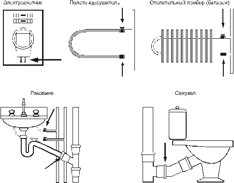 Граница раздела между общим и личным имуществом собственников помещений Границей раздела эксплуатационной ответственности между общим имуществом собственников в многоквартирном доме и личным имуществом собственника помещения (квартиры) является: § по строительным конструкциям – внутренняя поверхность стен помещения, оконные заполнения и входная дверь в помещение (квартиру). Т.е. окна, дверь и внутренняя отделка относятся к личному имуществу собственника помещения (квартиры); § на системе электроснабжения – входные соединительные клеммы автоматических выключателей, расположенных в этажном щитке. Т.е. квартирный электросчетчик, автоматические выключатели и внутренняя электропроводка с электрооборудованием – относятся к личному имуществу собственника помещения (квартиры); § на системе водоотведения (канализации) – плоскость раструба тройника канализационного стояка, расположенного в помещении (квартире). Т.е. система канализации, расположенная в помещении (квартире) до канализационного стояка, относится к личному имуществу собственника помещения (квартиры); § на системе газоснабжения – отсекающая арматура (вентиль) газопроводной трубы внутри квартиры. Т.е. соединительный газовый шланг (труба) после вентиля и газовая плита относятся к личному имуществу; § на системах отопления, горячего и холодного водоснабжения – отсекающая арматура (первый вентиль) от стояковых трубопроводов, расположенных в помещении (квартире). Т.е. первый вентиль и система далее – относятся к личному имуществу собственника помещения (квартиры). При отсутствии вентилей – по первым сварным соединениям на стояках трубопроводов. Если у полотенцесушителя нет отсекающего вентиля, он является общим имуществом, за исключением самостоятельно установленного. Аналогичный подход применяется и для отопительных приборов внутри собственных помещений. Т.е. если собственник заменил отопительный прибор (батарею) на другой, не предусмотренный проектной комплектацией, то новое оборудование становится его собственностью и обслуживается за его личные средства. В подъездах, в холлах, в фойе, в тамбурах и прочих местах общего пользования отопительные приборы всегда будут общими, независимо от их проектной или иной комплектацией. На приложенном рисунке схематично указаны стрелками границы раздела между общим имуществом собственников в МКД и их личным имуществом в помещении (квартире).