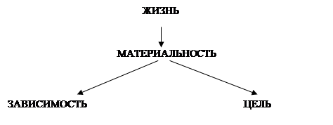 Связность Материального Мира может быть описана как зависимость, если понимать ее как ограничение, как темпоральное, так и нетемпоральное. Нетемпоральная зависимость иллюстрировалась Законами Синхронии, обсуждавшимися в 26 главе. Таким образом мы имеем "не-эссенциальную объединенность" Материального Мира. Разделение появляется с отделением причины от цели. В мире живого такое разделение собственно нельзя провести, и много путаницы возникает из-за предположения, что феномены жизни можно объяснить с одной из этих точек зрения. Именно разделение причины и цели составляет шаг творения, ведущий от восьмого к девятому члену Додекады Творения, Это разделение схематически можно представить так: