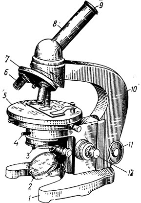 Об’єктиви мікроскопів – короткофокусні (1,5 мм і більше), а їх збільшення лежать в межах від 10 до 100. Окуляр являє собою складну лупу, до якої входить верхня окова лінза і нижня збиральна. Лінзи розташовані на відстані, що дорівнює півсумі їх фокусних відстаней. Ця оптична система також міститься в оправі. Окуляр виготовляють з фокусними відстанями від 0,85 до 12 см і збільшенням від 2 до 25. Окремі окуляри забезпечуються окулярним мікрометром – прозорою пластинкою, на якій нанесено шкалу з поділками від 0 до 8 мм (ціна поділки шкали 1 мм) і рухомі перехрестя та індекс у вигляді біштриха – двох штрихів. Розміщують окулярний мікрометр поблизу фокальної площини окуляра. Окулярний гвинтовий мікрометр призначений для вимірювання величини зображення об’єктів, що розглядаються в мікроскопі. Підбираючи різні об’єктиви і окуляри, збільшення мікроскопа можна змінювати в широких межах. Досліджувані предмети кладуть на предметний столик 5. Якщо вони прозорі, спостереження ведеться в прохідному світлі і освітлення здійснюється за допомогою дзеркала 2 і конденсора 4. Непрозорі предмети спостерігають у відбитому світлі при освітленні їх з боку об’єктива за допомогою спеціального освітлювача. Принципову схему побудови зображення в мікроскопі подано на рис. 3. Досліджуваний предмет AB розміщують недалеко за фокусом об’єктива F1. Його натуральна лінійна величина h. Об’єктив дає збільшене перевернуте дійсне зображення предмета A1B1 за подвійним фокусом об’єктива. Величина зображення h1. По відношенню до окуляра зображення A1B1 є предметом. Окуляр розміщують так, щоб зображення A1B1 попадало між його оптичним центром і фокусом.