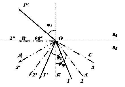 3. Падаючий промінь, відбитий промінь й заломлений промінь лежать в одній площині з перпендикуляром, установленим в точці падіння променя на границю розділу. Абсолютним показником заломлення середовища n називається величина, яка дорівнює відношенню швидкості світла в вакуумі с до швидкості світла в даному середовищі v: n = c/v (3) Абсолютні показники середовища 1 і середовища 2 будуть відповідно виражатися формулами: n1 = c/v1 i n2 = c/v2. Тоді відносний показник заломлення другого середовища по відношенню до першого дорівнює: n21 = n2/n1 (4) Якщо v1 > v2, то відносний показник заломлення n21 > 1. Тому, якщо промінь світла йде із середовища менш оптично густого в середовище оптично більш густе (n1 < n2), то кут падіння завжди більше кута заломлення. Якщо ж середовище 1, із якого падає промінь, оптично більш густе, чим середовище 2, то n21 < 1 і кут падіння завжди менше кута заломлення. В цьому випадку можливе явище повного внутрішнього відбивання. Явище повного внутрішнього відбивання має місце при переході світла із середовища оптично більш густого в середовище оптично менш густе. Нехай показник заломлення менш густого середовища буде n1 , а більш густого – n2 (n2 ≥ n1)