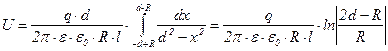 Рассмотрим систему из двух одинаковых металлических цилиндрических проводников радиусом R, имеющих одинаковые заряды q противоположного знака, с расстоянием между осями проводников 2 d. Между ними существует электрическое поле, которое можно характеризовать векторами напряженности электрического поля E, электрической индукции D и разностью потенциалов U. Для определения связи между разностью потенциалов и величиной заряда рассмотрим напряженность электрического поля на линии, соединяющей оси заряженных проводников (ось x). Она может быть определена на основе принципа суперпозиций. Напряженности от 1 и 2 шара будут направлены в одну сторону от положительно заряженного проводника к отрицательно заряженному проводнику. Пусть начало координат лежит в точке, расположенной на одинаковых расстояниях от оси двух проводников. Тогда напряженность в точке с координатой x можно определить по выражению