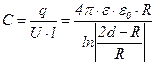 Удельная емкость (на единицу длины) между двумя проводниками можно найти по выражению