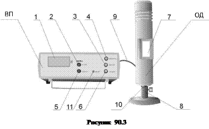 Принцип дії установки полягає в отриманні на екрані осцилографа залежності анодного струму I а газонаповненої лампи (тріода з підігрівним катодом) від напруги катод-сітка U кс при фіксованій напрузі анод-сітка з подальшим вимірюванням напруги в характерних точках. До складу установки входять об'єкт дослідження ОД і вимірювальний пристрій ВП (див. рис. 90.3). Об'єкт дослідження встановлюється в штативі 8 і з'єднується з вимірювальним пристроєм за допомогою кабелю 9. Об'єкт дослідження виконаний на базі манометричної лампи ПМИ-2, заповненої криптоном. Лампа поміщена в металевий корпус, на підставці якого є стійка 10 для установки її в штатив.