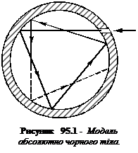 Тіло, що поглинає весь падаючий на нього потік випромінювання, незалежно від довжини хвилі і температури, називається абсолютно чорним тілом (АЧТ). Для нього Строго кажучи, АЧТ – наукова абстракція, таких тіл в природі не існує. Проте в обмеженому спектральному інтервалі багато тіл близькі до АЧТ, особливо маленький отвір в стінці великої замкнутої порожнини, стінки якої непрозорі і мають однакову температуру (рис. 95.1). Лише незначна частина випромінювання, що проникло в порожнину, вийде назовні. Отвір в порожнині служить експериментальною моделлю АЧТ і використовується в оптиці. Поряд з поняттям АЧТ використовують поняття сірого тіла, поглинальна здатність якого менше одиниці, але приблизно однакова для всіх довжин хвиль.