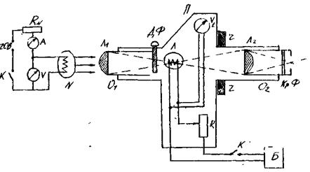 В радиационных пирометрах регистрируется энергетическая светимость исследуемого нагретого тела. В яркостных пирометрах - излучение в каком-либо узком участке спектра, т.е. испускательная способность исследуемого тела на определенной длине волны λ. В цветовых сравнивается испускательная способность на двух длинах волн Л 1 и Л 2 Измерение температуры тела в данной работе производится при помощи оптического яркостного пирометра с исчезающей нитью. Такой пирометр применяется в разных отраслях промышленности и имеет пределы измерения температур 700 – 2000 0С. Оптический пирометр с исчезающей нитью состоит из зрительной трубы П, в фокусе которой находится эталонная лампочка накаливания Л. Труба П наводится на источник излучения (в нашем случае - раскаленная нить лампочки накаливания N) при помощи линзы Л1, находящейся в фокусе объектива трубы O1, изображение нити лампы N сводится в плоскость нити лампочки Л (нити лампочек должны быть видны одинаково четко). Вторая линза Л2, помещенная в окуляре трубы. О2, дает увеличенное изображение нитей лампочки Л и лампочки N. Лампочка Л питается током от аккумуляторной батареи Б. Накал лампочки Л регулируется реостатом R посредством кольца r, находящегося в передней части трубы О2 пирометра. Регулируя реостатом R величину тока в лампочке Л, можно уравнять яркости обеих нитей накала, добившись исчезновения видимости нити Л на фоне нити N. В этом случае температура нитей станет одинаковой. При пользовании пирометром сравнение яркости происходит в ограниченной области спектра, поэтому для получения монохроматического излучения в трубе окуляра О2 помещен красный светофильтр. Температуру нити считают по вольтметру Vt, включенному параллельно эталонной лампочке, со шкалой, градуированной непосредственно в градусах. При температурь выше I400 0С необходимо вводить дымчатый светофильтр ДФ.