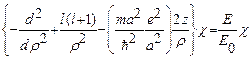 Рассмотрим движение электрона в кулоновском потенциале (например, электрон в атоме водорода или водородоподобных атомах). Для полного описания атома водорода следовало бы учесть: во-первых, движение обеих частиц – как протона, так и электрона; а во вторых, наличие спина у электрона. Мы используем два приближения: 1) будем считать протон очень тяжёлым (настолько, что он как бы закреплён в центре атома); 2) будем рассматривать электрон как частицу без спина. Небольшие магнитные эффекты появляются из-за того, что протон с точки зрения электрона есть циркулирующий по кругу заряд, который создаёт магнитное поле. Энергия электрона в этом поле будет различна, в зависимости от направление спина. В результате этого энергия атома будет немного сдвинута относительно ниже вычисленной величины. Мы пренебрежём этим слабым сдвигом энергии и вообразим, что электрон подобен волчку, движущемуся в пространстве по кругу и сохраняющему всё время одинаковое направление спина. Поскольку речь идёт о свободном атоме в пространстве, полный момент количества движения будет сохраняться. В нашем приближении будет считаться, что момент количества движения, вызываемый спином электрона считается неизменным, так что оставшийся момент количества движения атома («орбитальный» момент количества движения) также не будет изменяться. В очень хорошем приближении можно считать, что электрон движется в атоме водорода как частица без спина – его орбитальный момент количества движения постоянен. Для решения задачи воспользуемся уже полученными уравнениями, описывающими движение частиц в сферически-симметричном потенциале. Запишем стационарное уравнение Шредингера для радиальной составляющей волновой функции. Для этого перепишем уравнение (25.10) в виде: