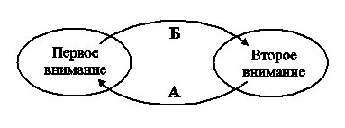Весь процесс можно описать как последовательные включения первого и второго внимания. Предположим, есть проблема, которую необходимо «обдумать» – принять решение или наметить ближайшие шаги, или подготовиться к переговорам, или что-либо еще. Первый шаг состоит в активизации первого внимания. Необходимо расфокусировать внимание и расширять тело, одновременно визуализируя все фрагменты выбранной проблемы – все, к чему привлекается спонтанное внимание. Как только выделится один или несколько напряженных фрагментов проблемы, необходимо воздействовать на них вторым вниманием до тех пор, пока они не будут интегрированы. На этом этапе полезны техники 3 и 6. После интеграции снова активизируется первое внимание. Теперь проблема будет выглядеть совершенно иначе. Если появились новые напряженные фрагменты, снова используется второе внимание, и т.д. до состояния полной ясности по поводу данной ситуации. Говорить о последовательности включений первого и второго внимания удобно только для описания процесса. В действительности, они действуют одновременно. Первое внимание выделяет объекты для воздействия второго внимания, второе внимание формирует контекст для восприятия из первого внимания. Так организовано их взаимодействие в процессе целостного (системного) мышления. Этот процесс является системным. Первое и второе внимание представляют собой две части системы, связанные двумя типами отношений (см. рисунок 34).
