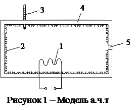 Это является еще одним определением а.ч.т., которое можно переформулировать так: тела, которые поглощают все электромагнитное излучение, падающее на них, называются абсолютно черными телами. Исторически было так, что тела, с которыми имели дело исследователи и для которых условие (1) выполнялось или почти выполнялось, были действительно телами черного цвета. Но потом оказалось, что условие (1) выполняется и для такого совершенно не черного тела как Солнце. Тем не менее прилагательное «черное» сохраняется, имея номинальный смысл, обозначая тела, для которых выполняется условие (1). 2.2. Лабораторная модель а.ч.т. Закон Стефана–Больцмана В качестве лабораторной модели абсолютно черного тела часто пользуются печью, схематически изображенной на рис. 1. Печь нагревается электрическим током 1. Внутри ее покрывают углем Во второй половине XIX века Стефан и Больцман эмпирически установили эту зависимость в следующем виде: