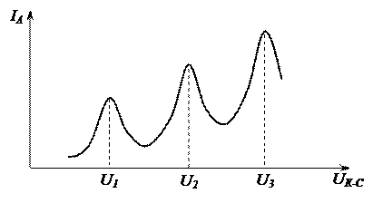 При наличии разреженного газа электроны сталкиваются с атомами газа. Пока энергия электронов мала, столкновения их с атомами носят упругий характер, и они не теряют энергию. При увеличении энергии электронов столкновения становятся неупругими. Электроны при этом с большой вероятностью теряют энергию и не доходят до анода. Анодный ток IА резко уменьшается. При дальнейшем увеличении ускоряющего напряжения U К-С электроны снова набирают энергию, и анодный ток снова увеличивается. Зависимость анодного тока от ускоряющего напряжения между катодом и сеткой U К-С- имеет вид (рис 2).