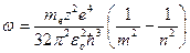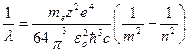 Таким образом, из выражения (5.10) следует: ¨ Полная энергия электрона в атоме отрицательна. ¨ Энергия электрона в атоме принимает дискретный ряд значений, которые представлены на рисунке 5.1 При n =1 энергия минимальна, при n →∞ энергия электрона максимальна, и он покидает атом. Атом при этом ионизируется. Воспользуемся третьим постулатом Бора и формулой энергии электрона (5.10), определим длину волны излучения при переходе электрона из одного энергетического состояния в другое. Длина волны связана с циклической частотой соотношением