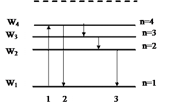 где R – постоянная Ридберга. Теория Бора смогла объяснить факт испускания света атомом: при переходе электрона из состояния с большей энергией Wn в состояние с меньшей энергией Wm атом излучает квант энергии При поглощении порции энергии ΔW электрон переходит из основного состояния (n =1) в возбужденное (переход 1 на рисунке 5.2). В этом состоянии атом пребывает незначительный промежуток времени Δt~10-8 с, а затем переходит в основное состояние, причем этот переход может осуществляться ступенчато.