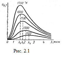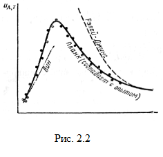Константа b, называемая постоянной закона Вина, равна b = 0,0028978 м · К (λ выражена в метрах). Таким образом, при повышении температуры растет не только полное излучение, но, кроме того, изменяется распределение энергии по спектру. Например, при малых температурах тела изучают главным образом инфракрасные лучи, а по мере повышения температуры излучение делается красноватым, оранжевым и, наконец, белым. На рис. 2.1 показаны эмпирические кривые распределения энергии излучения абсолютно черного тела по длинам волн при разных температурах: из них видно, что максимум спектральной плотности излучения при повышении температуры смещается в сторону коротких волн. 3. Закон Планка. Закон Стефана — Больцмана и закон смещения Вина не решают основной задачи о том, как велика спектральная плотность излучения, приходящаяся на каждую длину волны в спектре абсолютно черного тела при температуре Т. Для этого надо установить функциональную зависимость и от λ и Т. Основываясь на представлении о непрерывном характере испускания электромагнитных волн и на законе равномерного распределения энергии по степеням свободы (принятых в классической физике), были получены две формулы для спектральной плотности и лучения абсолютно черного тела: 1) формула Вина