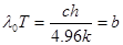 Расчет по этой формуле дает результат, совпадающий с эмпирическим значением постоянной Стефана — Больцмана. Закон смещения Вина и его константу можно получить из формулы Планка нахождением максимума функции uλТ, для чего берется производная от uλТ по λ, и приравнивается нулю. Вычисление приводит к формуле: