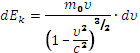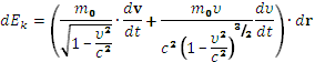 Очевидно, что эти уравнения, отличающиеся от уравнений Ньютона, должны приводить к иным следствиям, чем уравнения классической механики. Проверка этих следствий на опыте является проверкой и самих уравнений. Как известно, в классической механике уравнение движения может быть записано в виде: p = m0 v / Исключительно важным следствием механики теории относительности является вытекающая из нее связь между энергией и массой. Установим это соотношение, основываясь на формуле (3). В классической механике изменение кинетической энергии материальной точки определяется по работе, совершенной силами, приложенными к точке. Проведем соответственное рассмотрение для уравнения (3). Элементарная работа dА силы f равна скалярному произведению силы на перемещение d r точки: dA= f · d r. Эта величина должна давать приращение кинетической энергии точки: dA =dEk. На основании формулы (3) имеем: dEk = dA = Выполняя дифференцирование, получим: