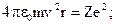 где сила, стоящая в правой части этого уравнения, представляет собой кулоновскую силу взаимодействия двух зарядов: е и Ze, a величина v2 /r характеризует центростремительное ускорение электрона. Сокращая знаменатели обеих частей этого уравнения и используя выражение второго постулата Бора, получаем систему из двух уравнений, где неизвестными являются скорость v и радиус орбиты r: